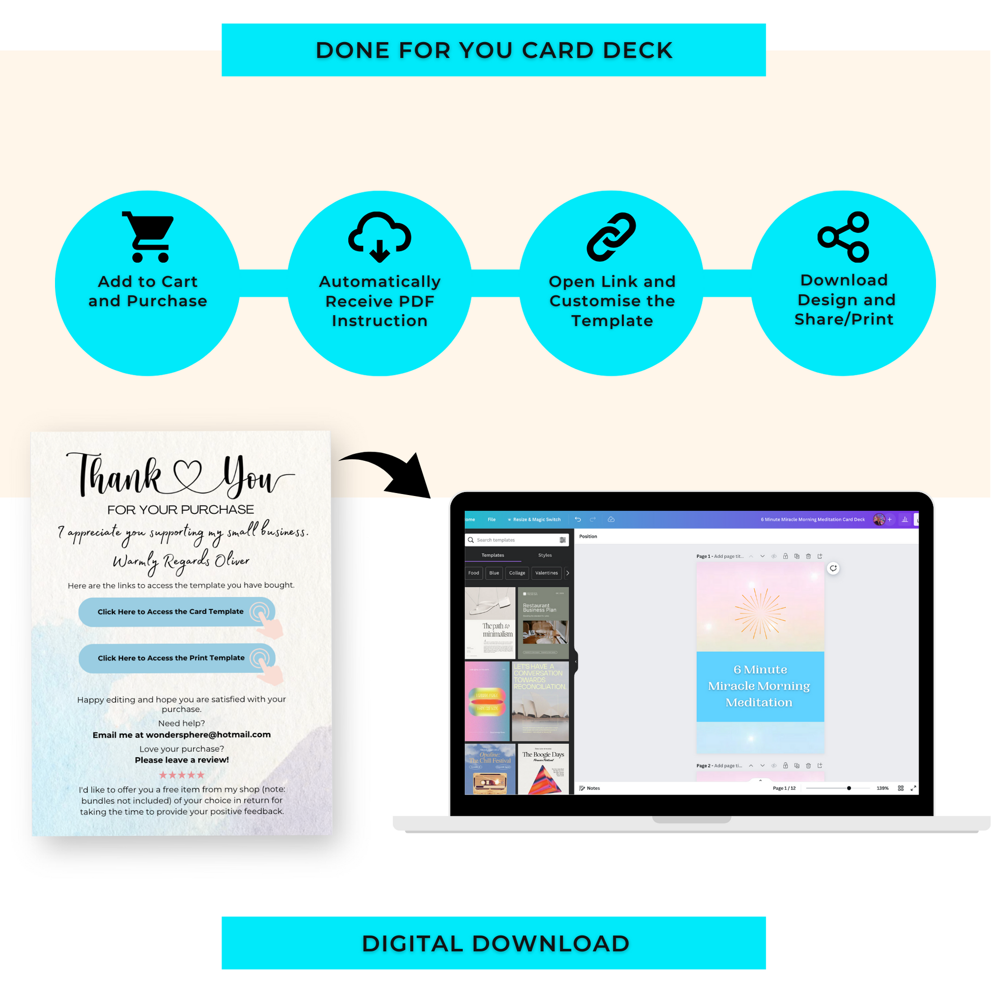 Save time and money with this Done-for-You Meditation Card Deck on Canva. Simply add your own color, logo, font, icons.