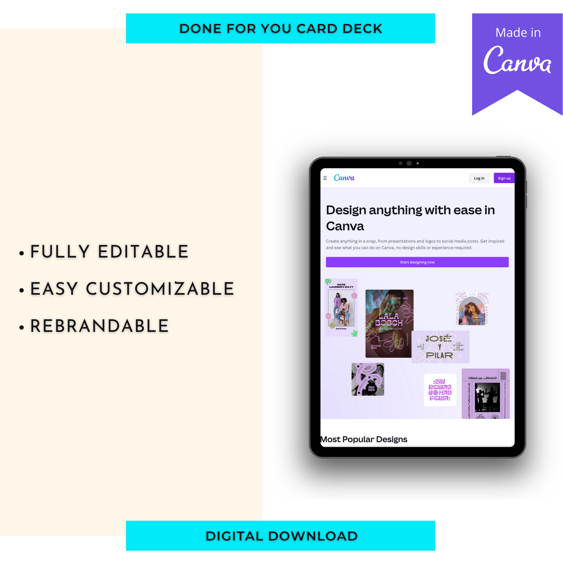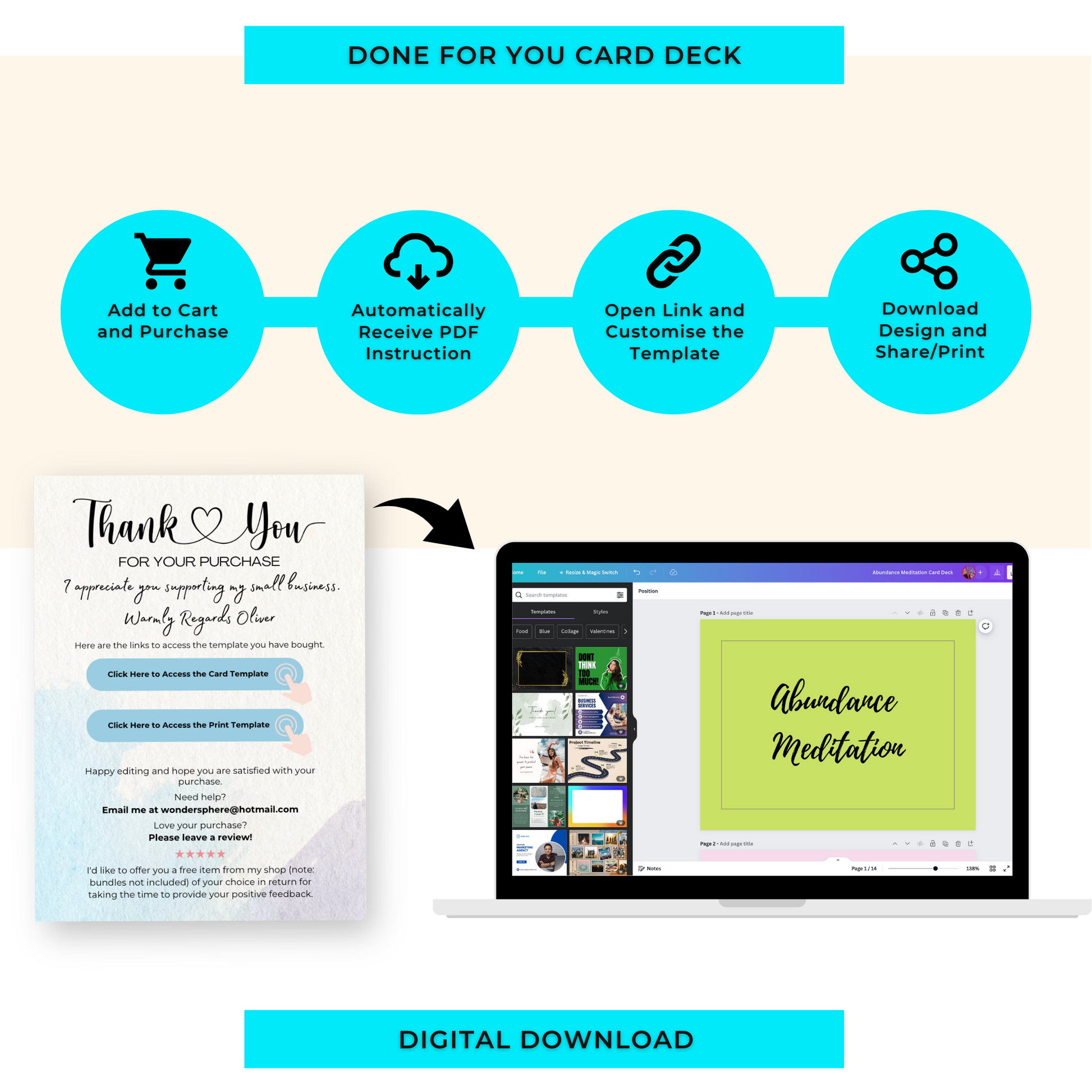 Save time and money with this Done-for-You Meditation Card Deck on Canva. Simply add your own color, logo, font, icons.