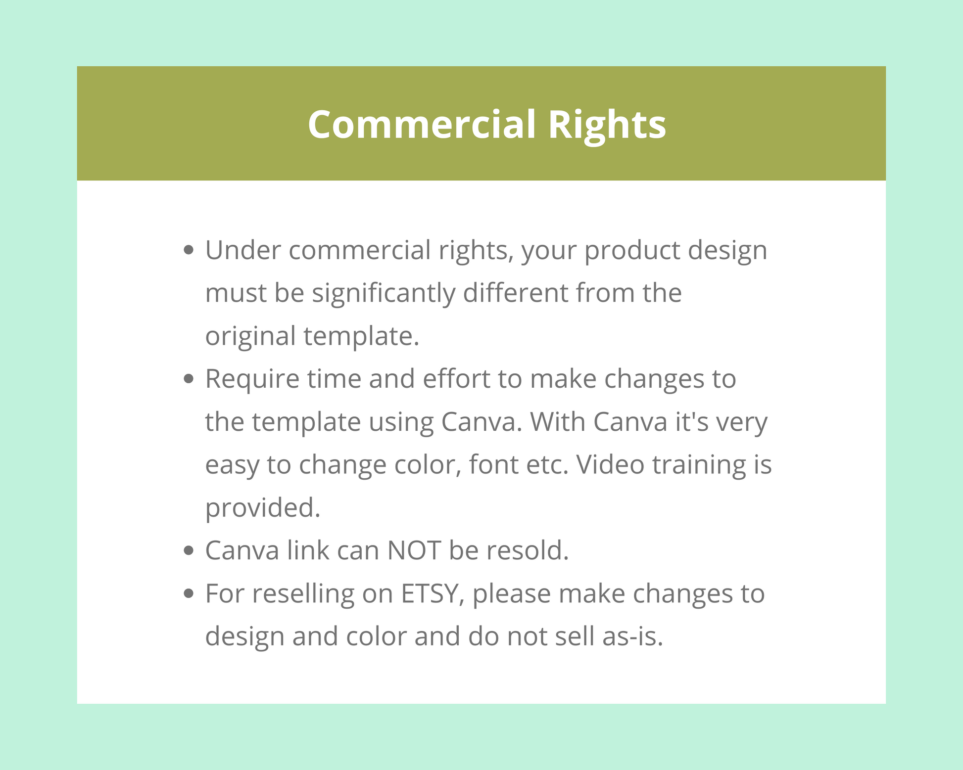 • Under commercial rights, your product design must be significantly different from the original template.