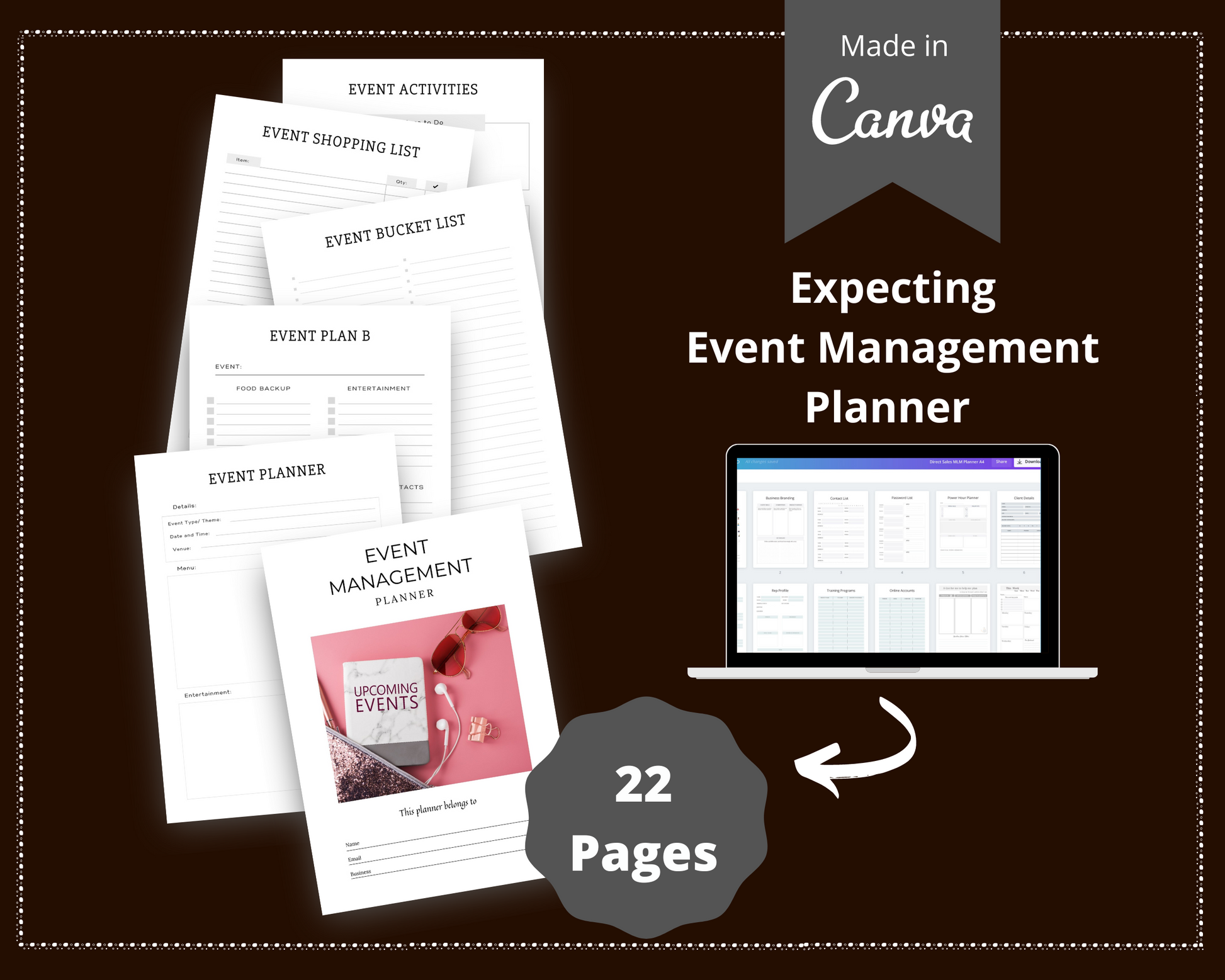 Save time and money with this Done for You Event Management Planner on Canva. Simply add your own color, logo, font, icons.
