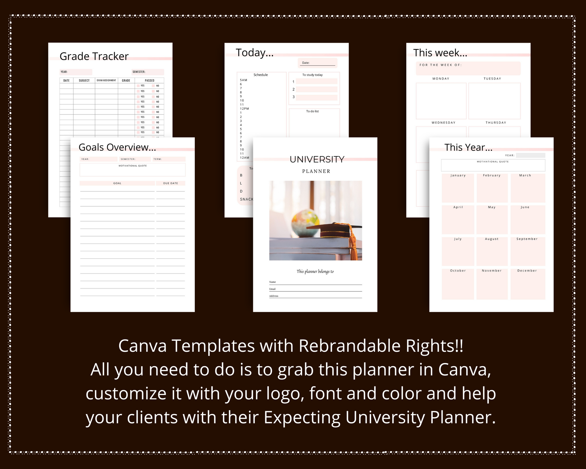 Save time and money with this Done for You University Planner on Canva. Simply add your own color, logo, font, icons.