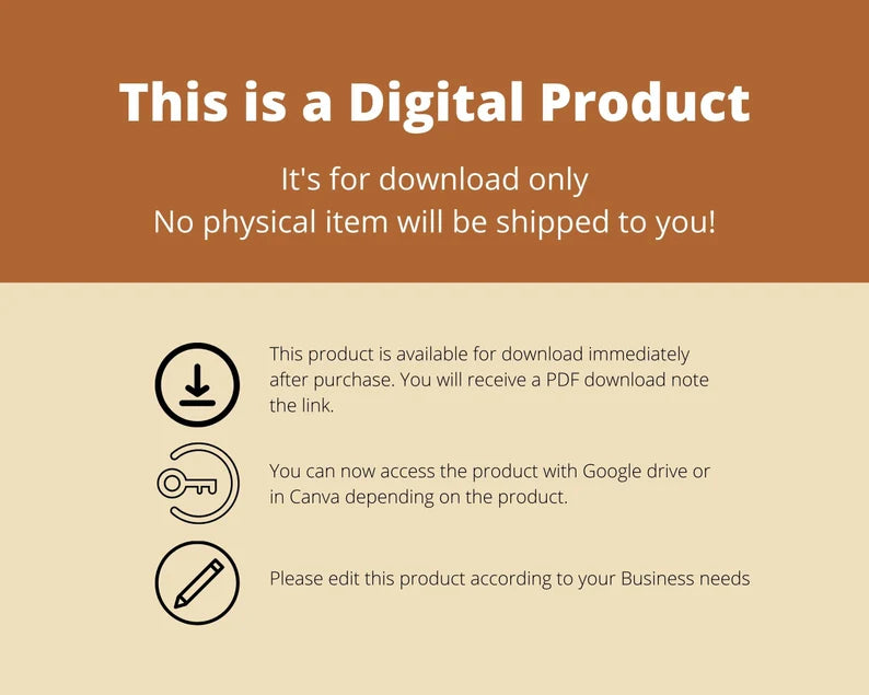 This is a digital product and it's available for download immediately after purchase. No physical item will be shipped. Please edit this template according to your business needs.