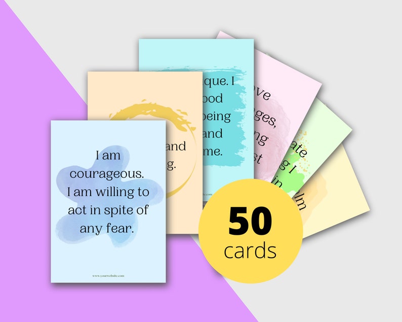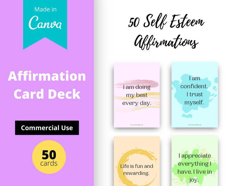 Self Esteem Affirmation Card Deck | Editable 50 Card Deck in Canva | Commercial Use