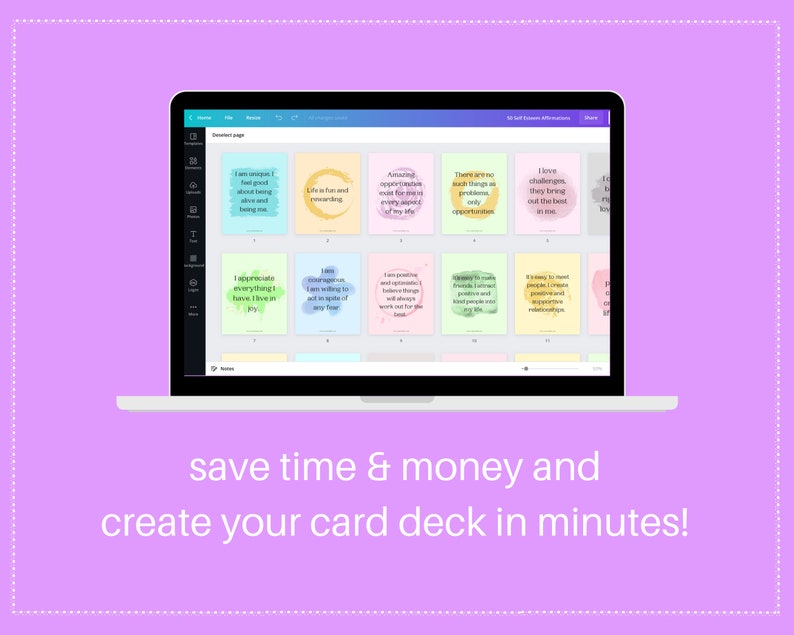 Save time and money with this Done-for-You Affirmation Card Deck on Canva. Simply add your own color, logo, font, icons.